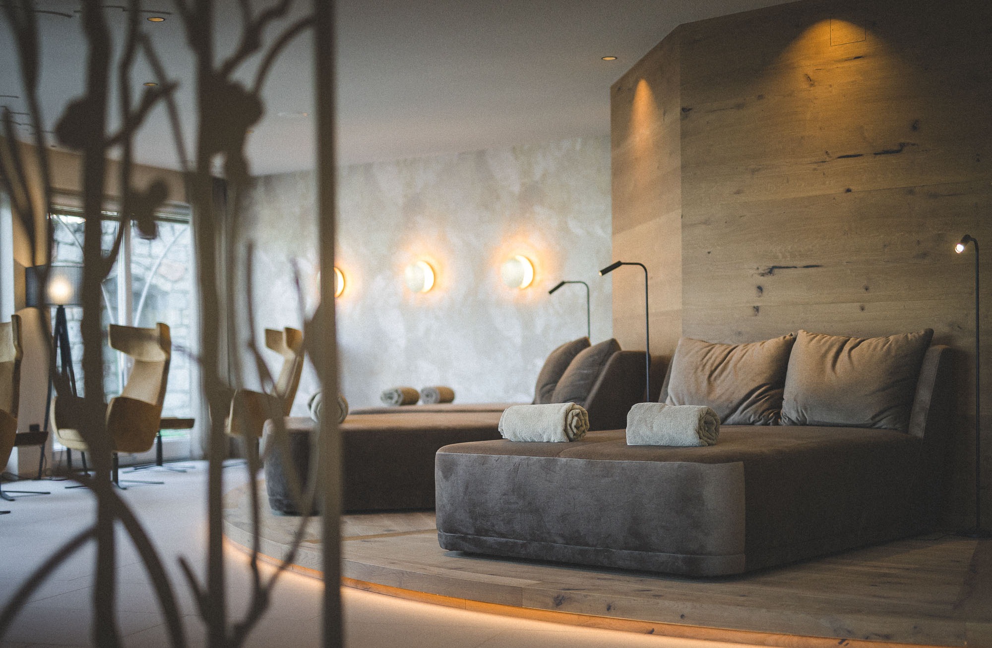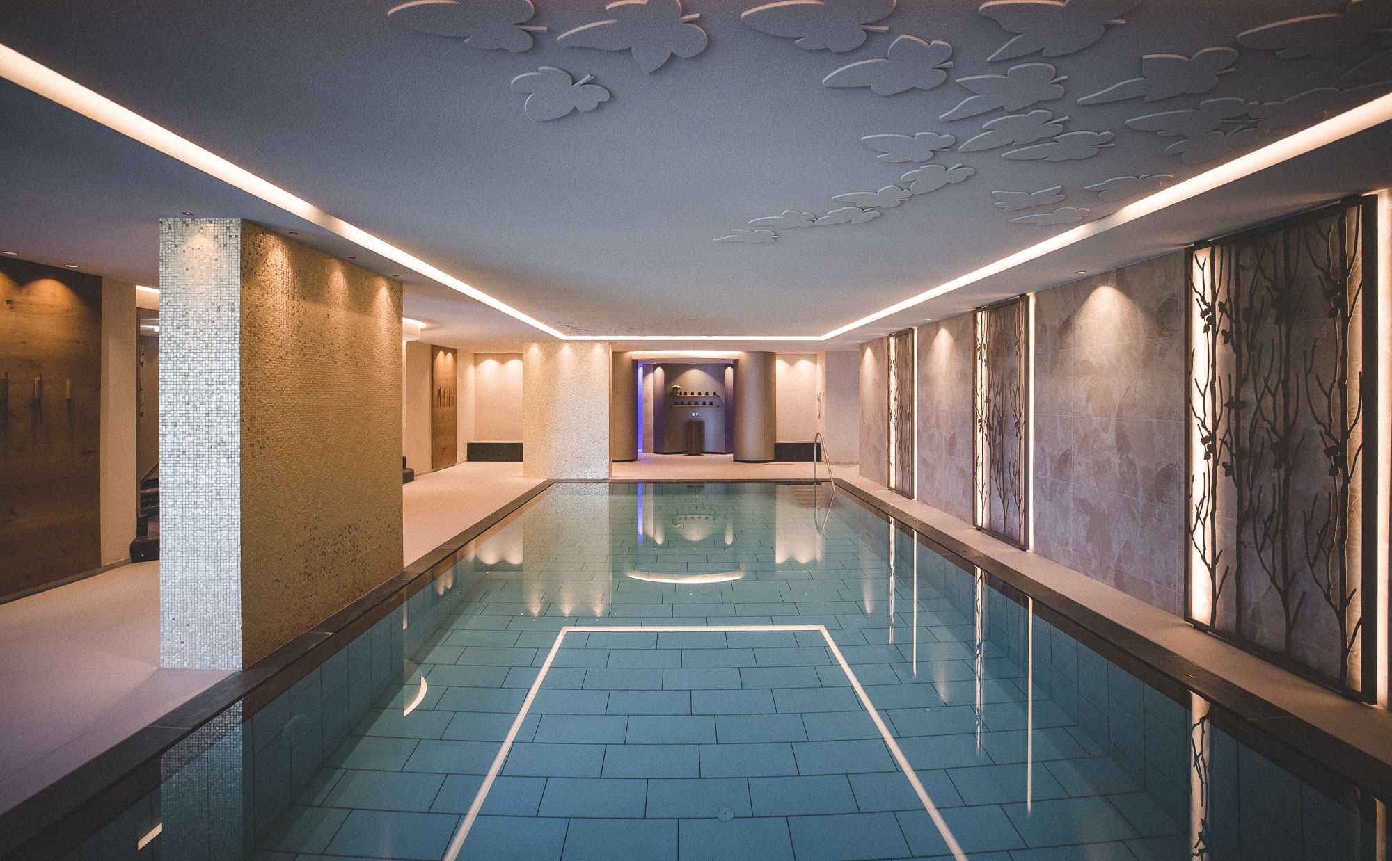Die Wasser- und Wellnesswelt umfasst vier verschiedene Saunen, ein 10 m langes Hallenbad, Whirlpool und Kneippbecken – eingebettet in ein stimmungsvolles Ambiente, das fließend in den Garten übergeht.