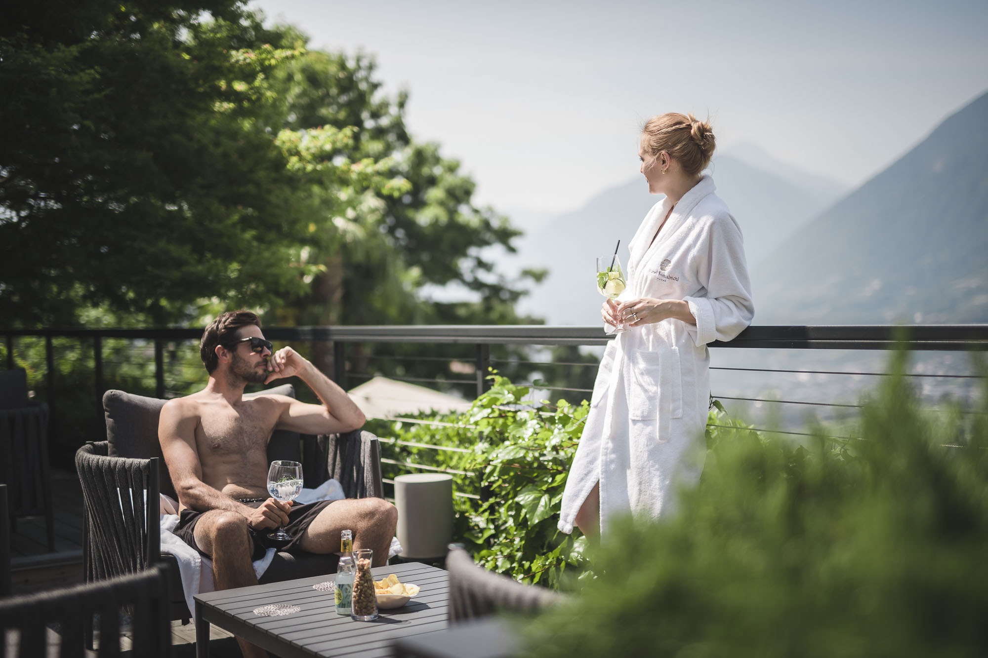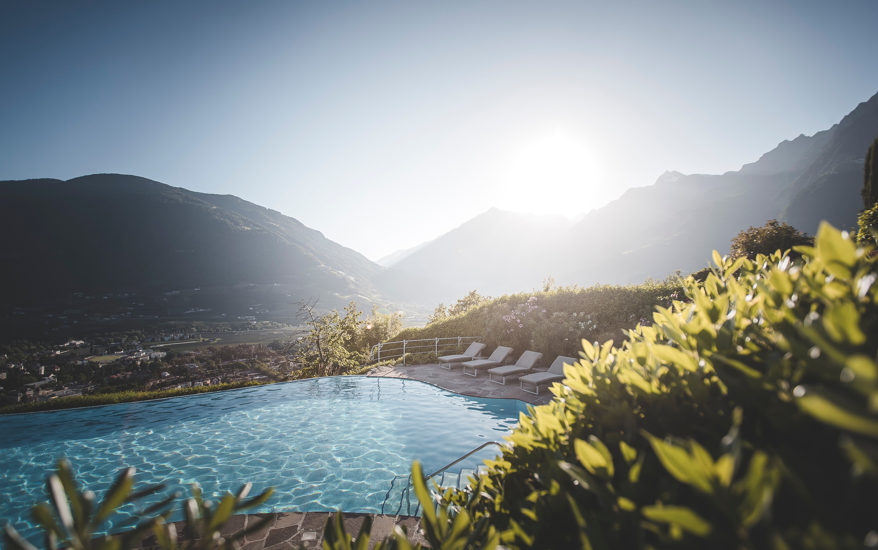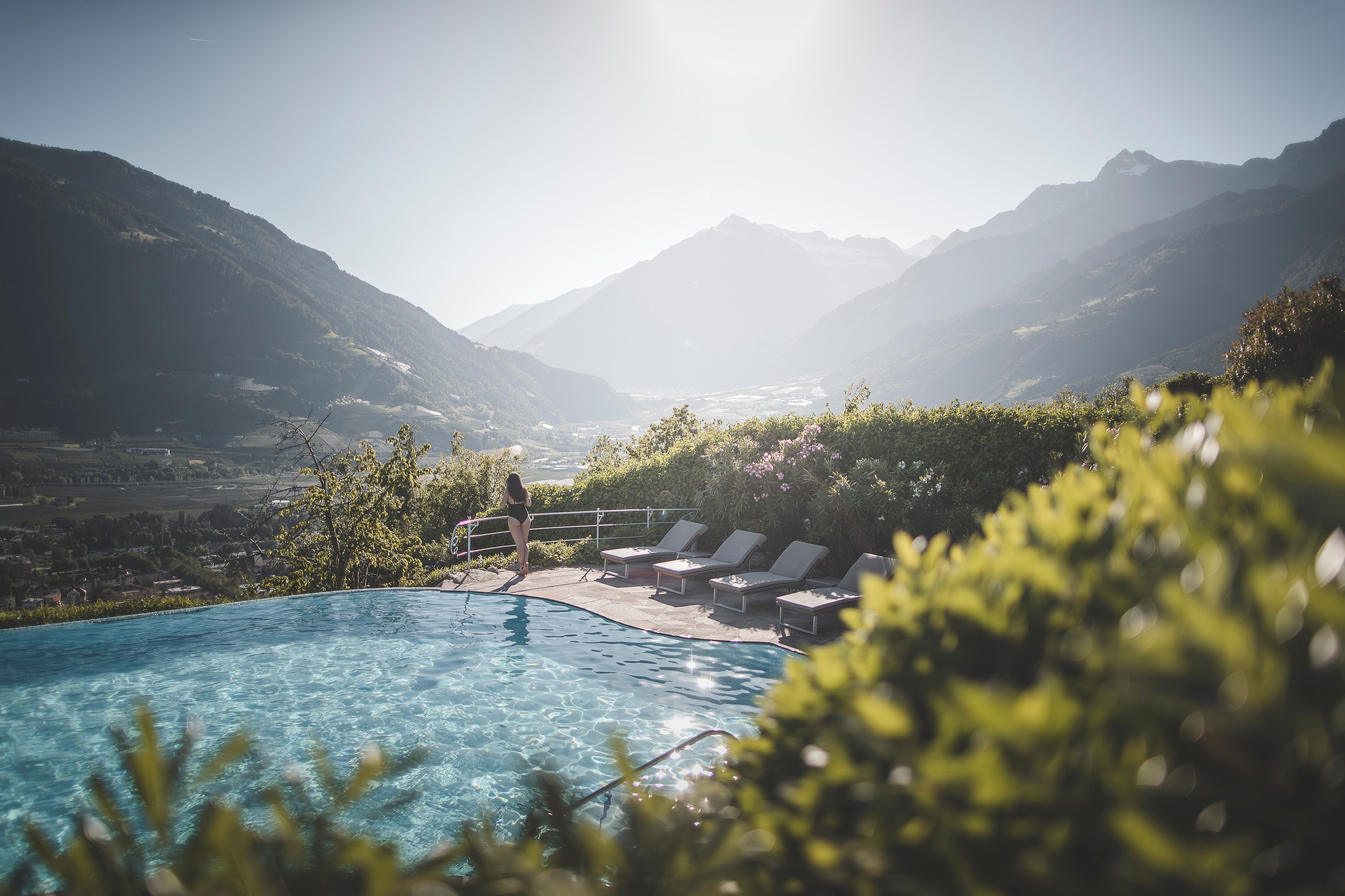 Der mediterran-alpine Gartenpark mit beheiztem Außenpool, Hängeschaukeln, Gazebos und Sonnenterrasse bietet auf über 1.000 m² Raum für Erholung mit Weitblick über die Dächer von Meran.